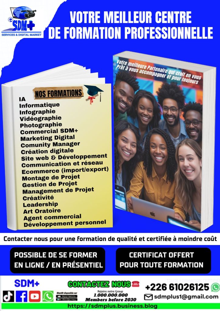 Créé par une équipe de jeunes ambitieux et talentueux unis pour l’émergence et le développement du monde, Le SERVICES AND DIGITAL MARKET PLUS (SDM+) a vue le jour et est devenu fonctionnel qu’en 2023. C’est un Service international, Virtuel et Présentiel qui ne se limite pas de frontière. Nous intervenons dans plusieurs domaines tels que le Marketing, La Publicité-Visuel, la formation professionnelle, le BTP, l’agro-business et divers.